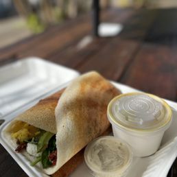 Very delicious! This was my first time trying the food here, and I loved it. It was so tasty and fresh! I ordered the Full Belly Dosa. It's a thin savory crepe made with potato masala, goat cheese, sun dried tomatoes, spinach, and avocado. It comes with a bowl of Sambar Soup and a side order of either coconut or tomato chutney. I chose coconut. The soup is made of lentils and vegetables and is very delicious. It's a $20 meal but a meal for two unless you are very hungry. The menu has both savory and sweet so next time I visit I'll try something sweet. There is indoor and outdoor seating. Also a very friendly atmosphere. Service is quick and you can even watch your dosa being made. Definitely a thumbs up